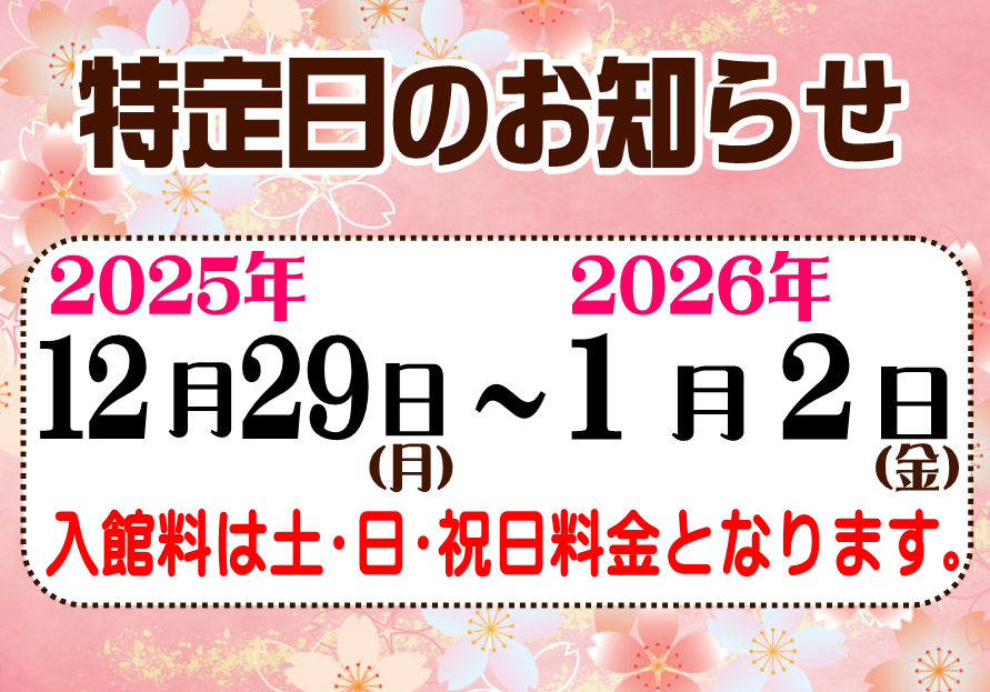 年末年始 特定日のお知らせ 2025.12.05 令和7年12月29日(月)~令和8年1月2日(金) 上記の期間を特定日とさせていただきます。 入館料は土日・祝日料金となります。 ご理解の程よろしくお願いします。 新しい記事へ 一覧で見る 古い記事へ