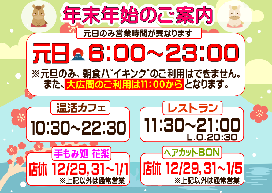 年末年始 営業時間のお知らせ 2025.12.13 年末年始の営業時間について 元日のみ朝6:00より営業いたします。 元日はホテル宿泊者以外、朝食バイキングのご利用はできません。 大広間は11:00よりご利用できます。 また、各店舗の店休日等は下記をご参照くださいませ。 新しい記事へ 一覧で見る 古い記事へ